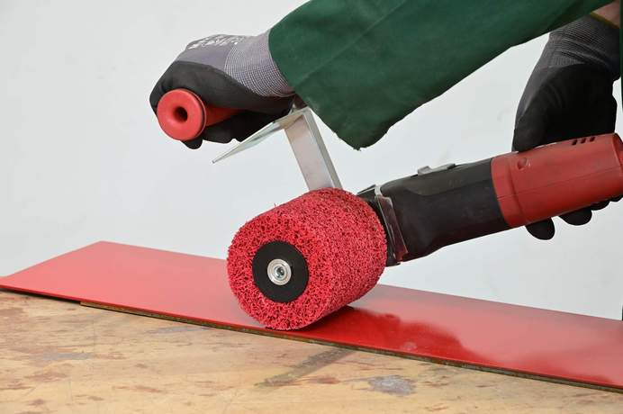 With this attachment a common, adjustable angle grinder becomes a satin finisher.