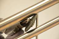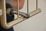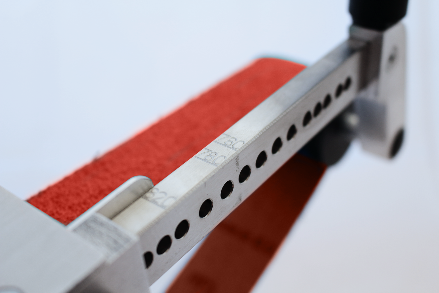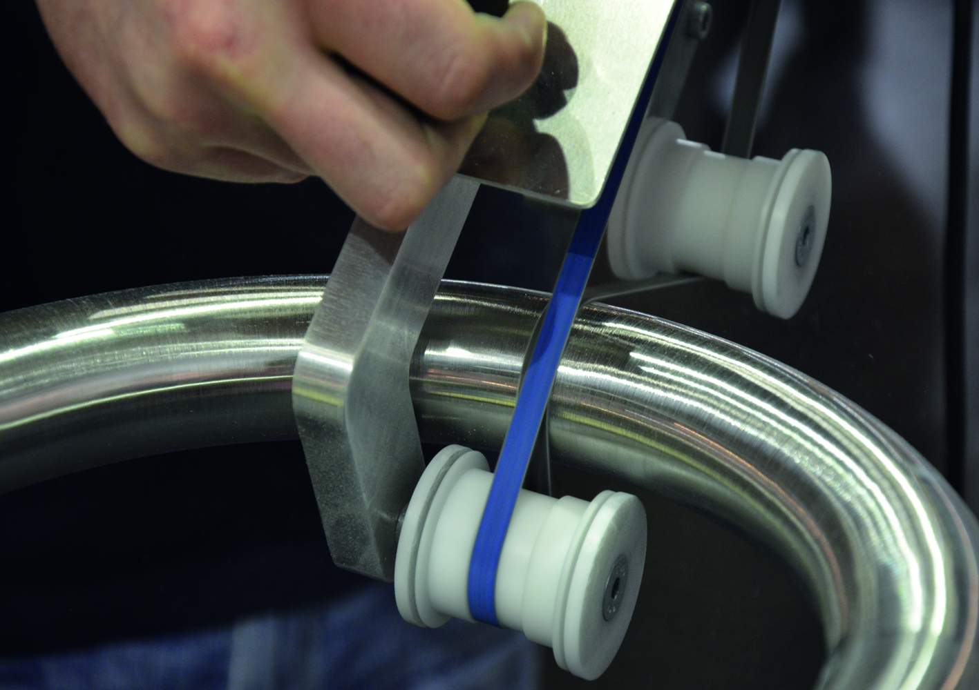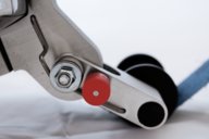 verstellbarer Teleskop-Arm für den Einsatz von handelsüblichen Bandlängen 610, 650, 760, 780 und 820 mm, Führungsrollen mit Wechselsystem, Schwenkarm mit Arretierung