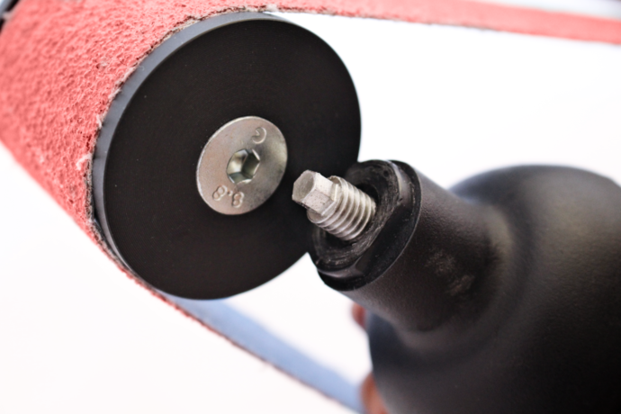 - Durch die feststehenden Seitenscheiben an den Führungsrollen wird das Schleifband zwangsgeführt; ein Ablaufen des Schleifbandes ist nahezu ausgeschlossen